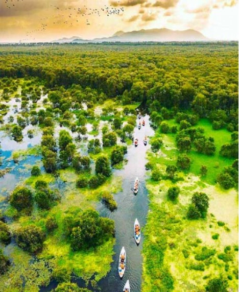 Sau bữa điểm tâm sáng, xe đưa đoàn rời Châu Đốc, đi tham quan Rừng tràm Trà Sư, một trong những khu rừng ngập nước có diện tích lớn ở miền Tây Sông Hậu. Là nơi trú ngụ, sinh tồn của hàng trăm loại chim, cá, loại lưỡng cư, và nhiều động thực vật khác, xuồng xuôi theo những con rạch đầy lục bình bèo hoa dâu xanh m ướt, xen lẫn là những đầm bông sen hồng, bông súng tím.